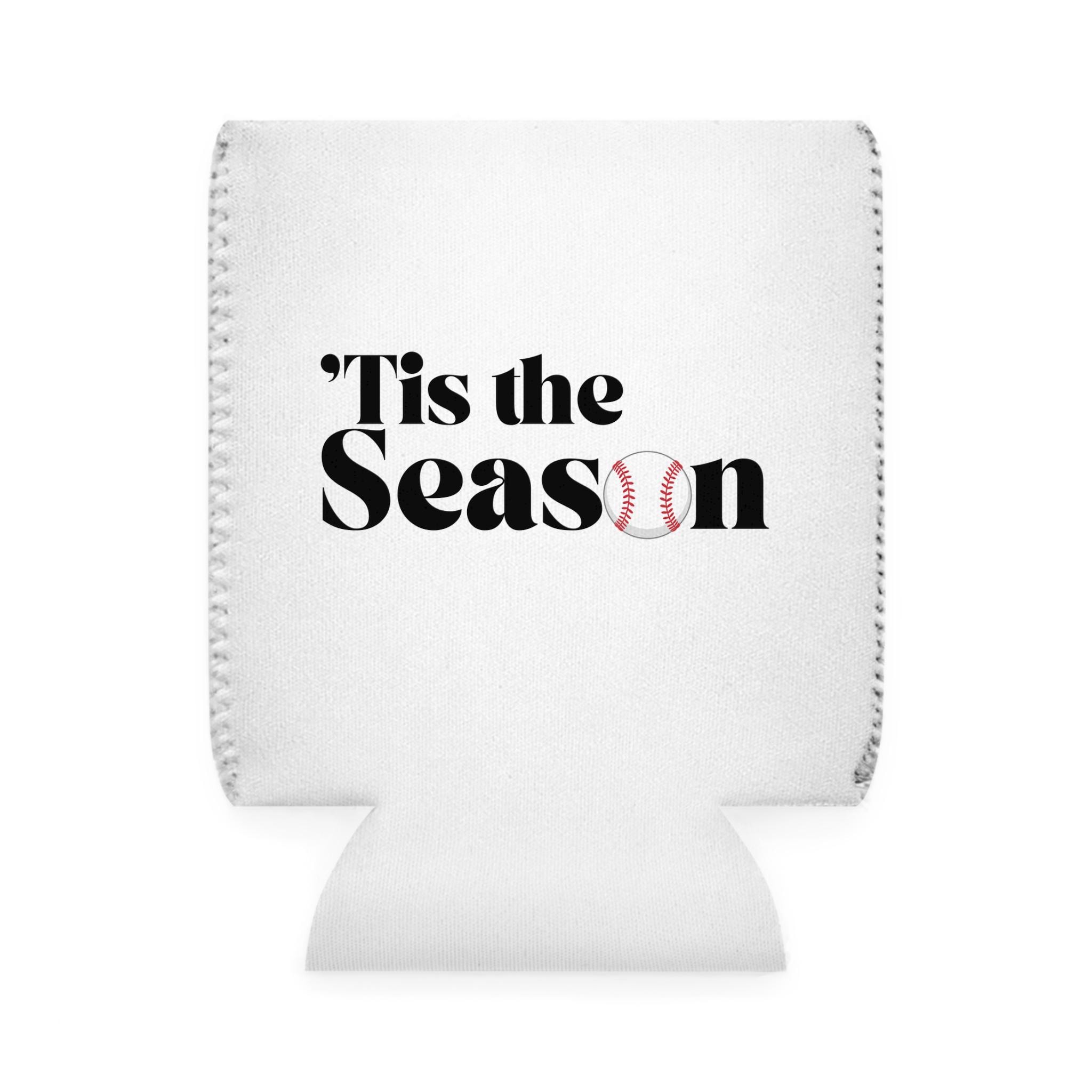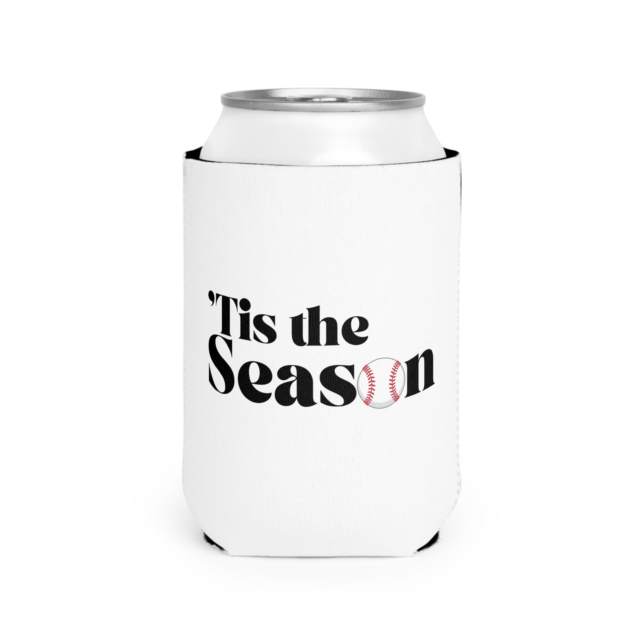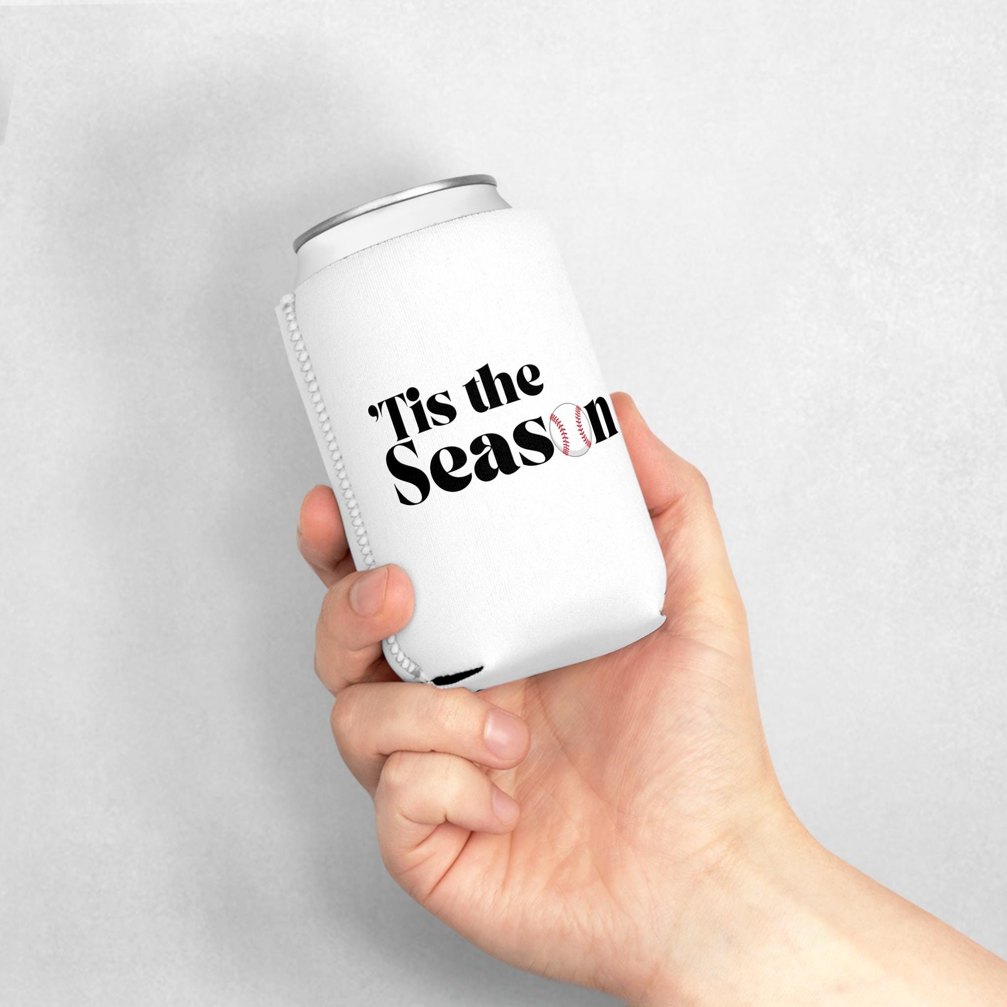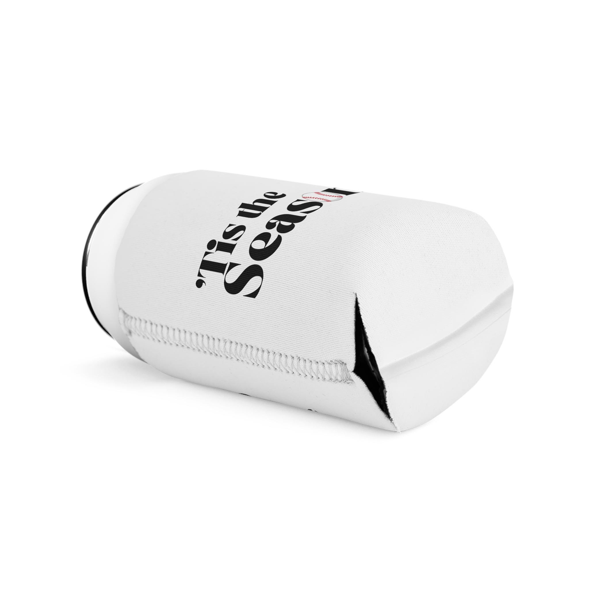 Lightweight, collapsible, and built for long afternoons at the ballpark or backyard tailgates. This neoprene can cooler sleeve slips over a standard 12 oz can and seals in the chill so drinks stay cold while you cheer. The clean white canvas showcases bold, sports-ready text — one side reads ’Tis the Season with a baseball integrated into the lettering, the other side offers a customizable rally message or player name. Subtle black interior and matched thread give a finished look, and the 1/4" thickness provides cushion and grip without bulk. Bring it to games, team events, or weekend cookouts to keep your beverage cool and your support loud.